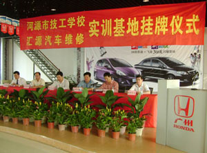 10月26日上午,河源市技工學(xué)校匯源汽車(chē)銷(xiāo)售公司實(shí)訓(xùn)基地掛牌儀式在匯源汽車(chē)銷(xiāo)售公司舉行。河源市技工學(xué)校100多名師生、匯源汽車(chē)銷(xiāo)售公司部分員工參加了掛牌儀式。市委常委、市政府副市長(zhǎng)楊耀初同志,市政府邱榮輝副秘書(shū)長(zhǎng),及市勞動(dòng)保障局等部門(mén)領(lǐng)導(dǎo)出席了掛牌儀式。掛牌儀式由市勞動(dòng)保障局歐繼勝副局長(zhǎng)主持,匯源集團(tuán)賴(lài)運(yùn)宏董事長(zhǎng)在掛牌儀式上致詞,市技工學(xué)校歐陽(yáng)仕文校長(zhǎng)發(fā)表講話(huà)。最后,楊耀初副市長(zhǎng)作了重要講話(huà)。楊副市長(zhǎng)充分肯定了匯源汽車(chē)銷(xiāo)售公司與市技工學(xué)校的合作,高度贊揚(yáng)了匯源汽車(chē)銷(xiāo)售公司勇?lián)鐣?huì)責(zé)任、充滿(mǎn)愛(ài)心的企業(yè)精神;希望校企繼續(xù)努力,更快、更好地為社會(huì)培養(yǎng)更多、更優(yōu)的有用人才!
