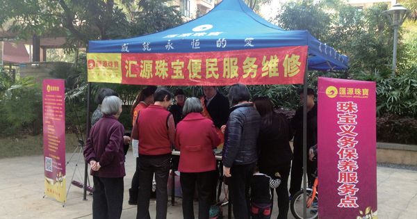 匯源珠寶在小區(qū)開設(shè)義務(wù)保養(yǎng)服務(wù)店,為街坊提供免費(fèi)的保養(yǎng)服務(wù)。